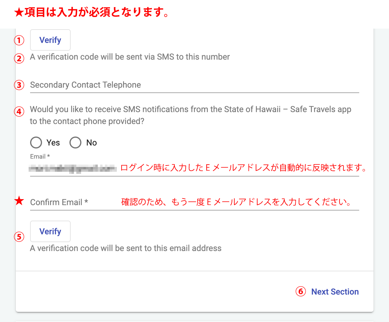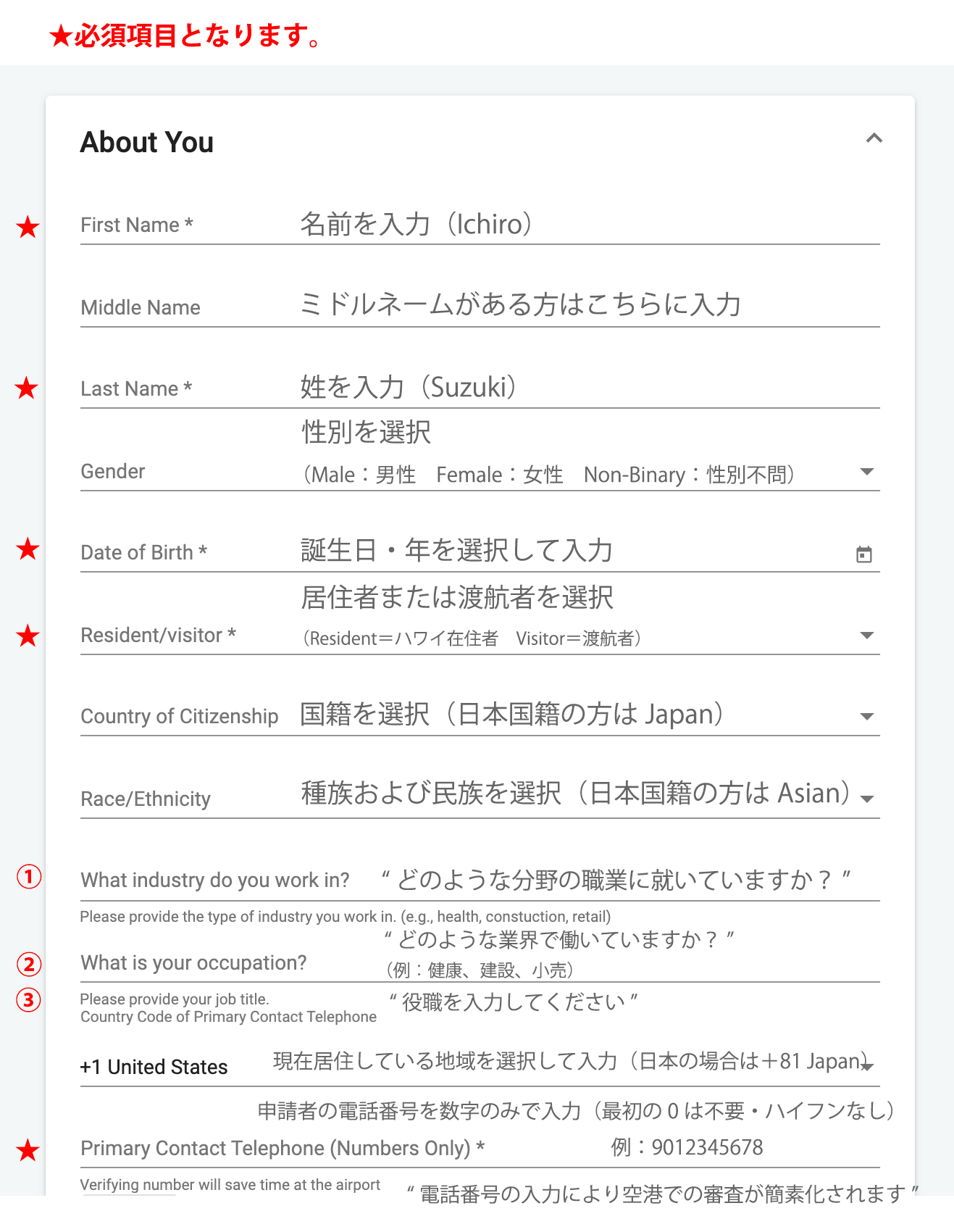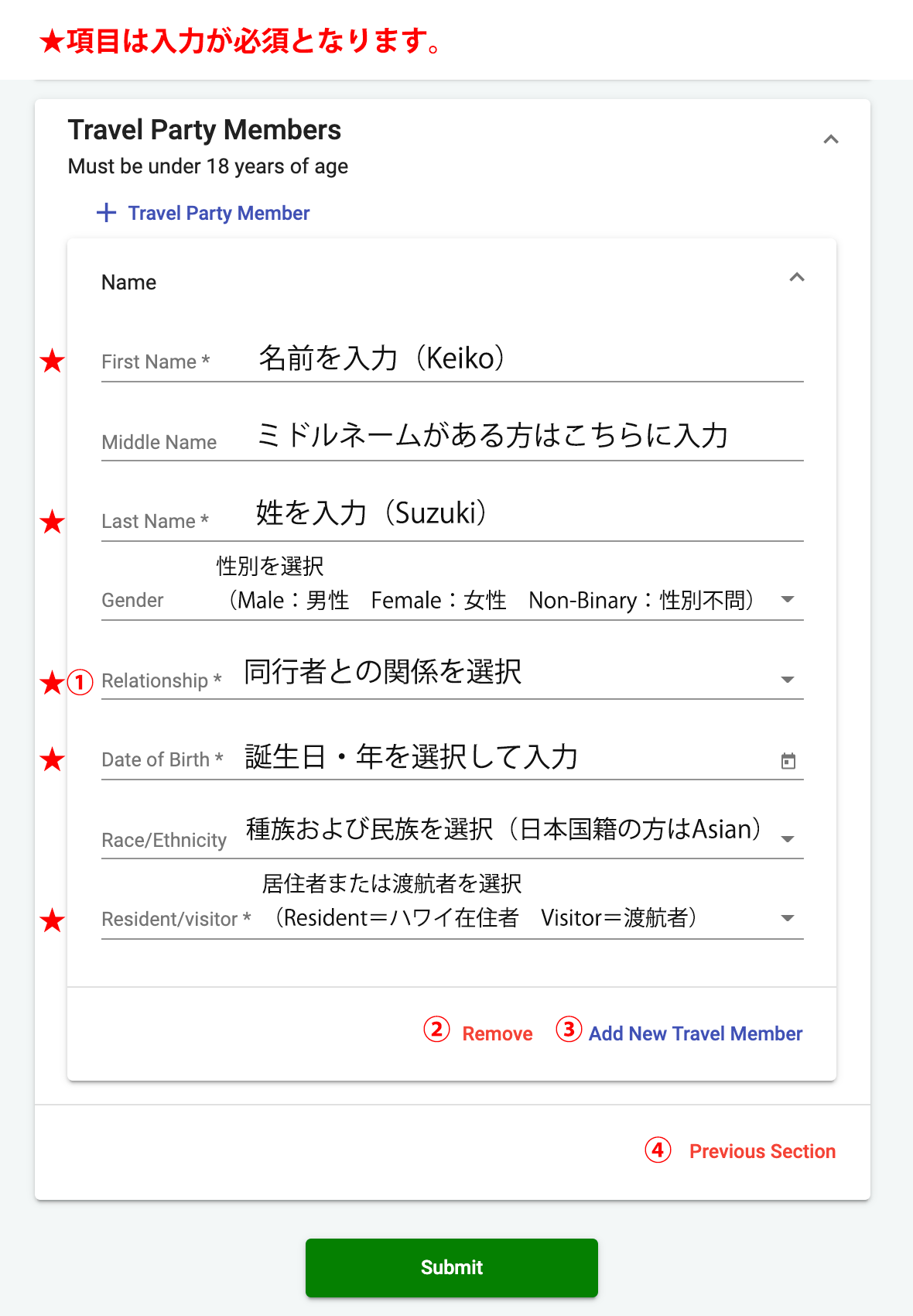 全ての渡航者はアスタリスク(*)が付いている必須項目に情報を入力する必要があり、その内容が登録されています。
