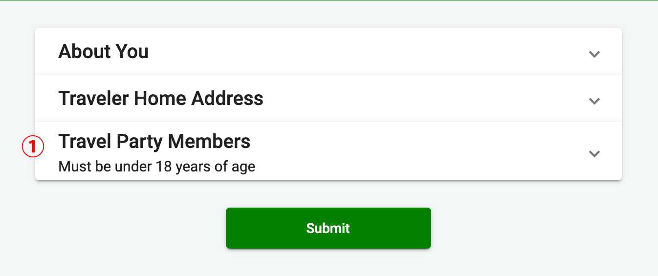 ①Travel Party Membersをクリックし、未成年者専用フォームに同行者の情報を入力してください。